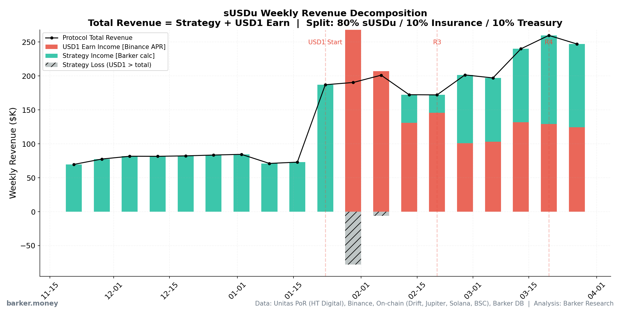 Starting from Unitas's weekly PoR audit reports and exchange_rate data, we calculated the protocol's actual revenue week by week and separated out the USD1 Earn campaign interest contribution.