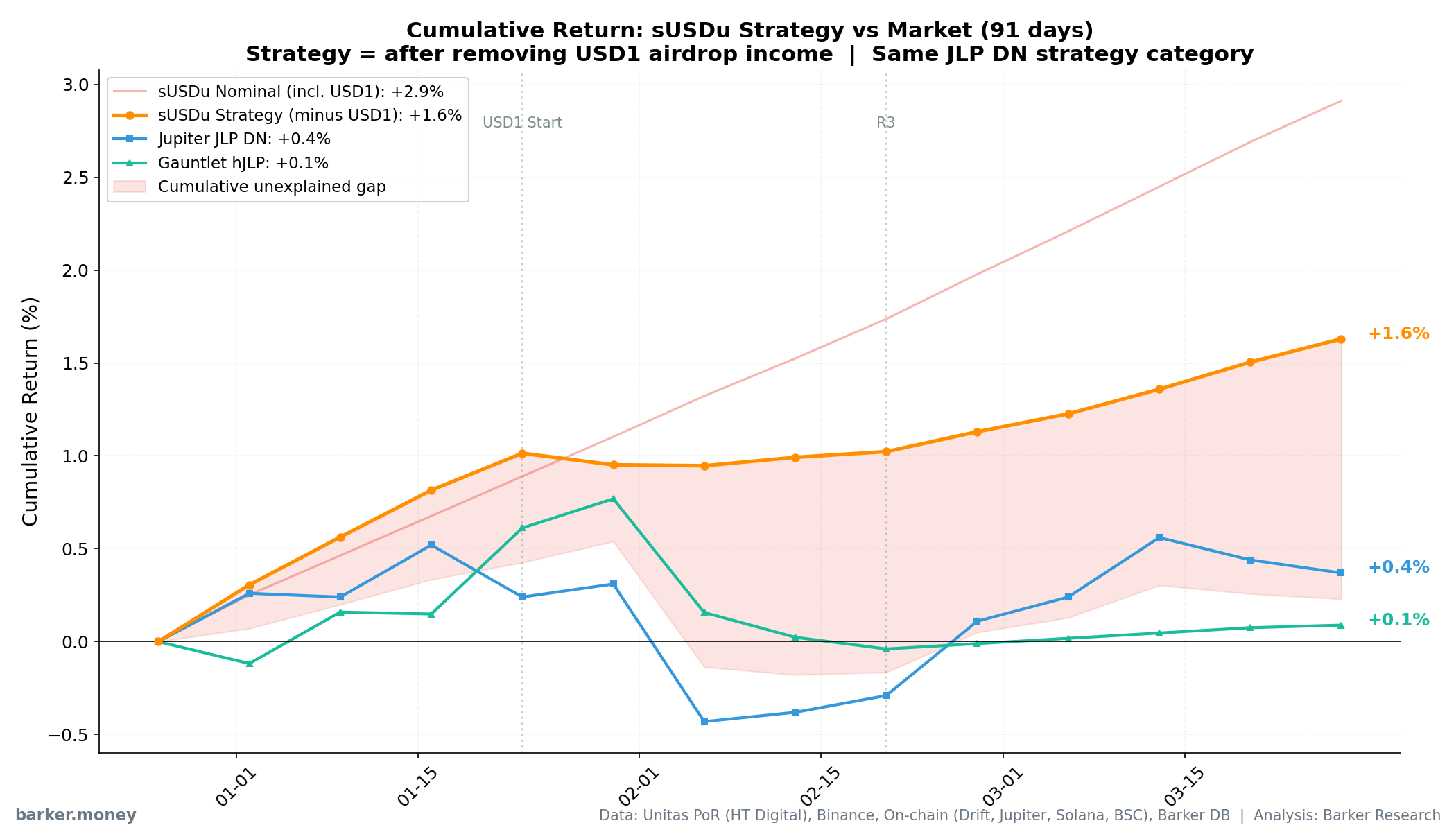 We tracked the performance of 10 similar JLP Delta Neutral vaults on Drift. Over the past 91 days, Jupiter JLP DN returned a cumulative +0.4%, Gauntlet hJLP returned +0.1%. Meanwhile, the strategy component of sUSDu (after removing USD1 campaign income) returned +1.6% over the same period, or +2.9% including USD1 income.