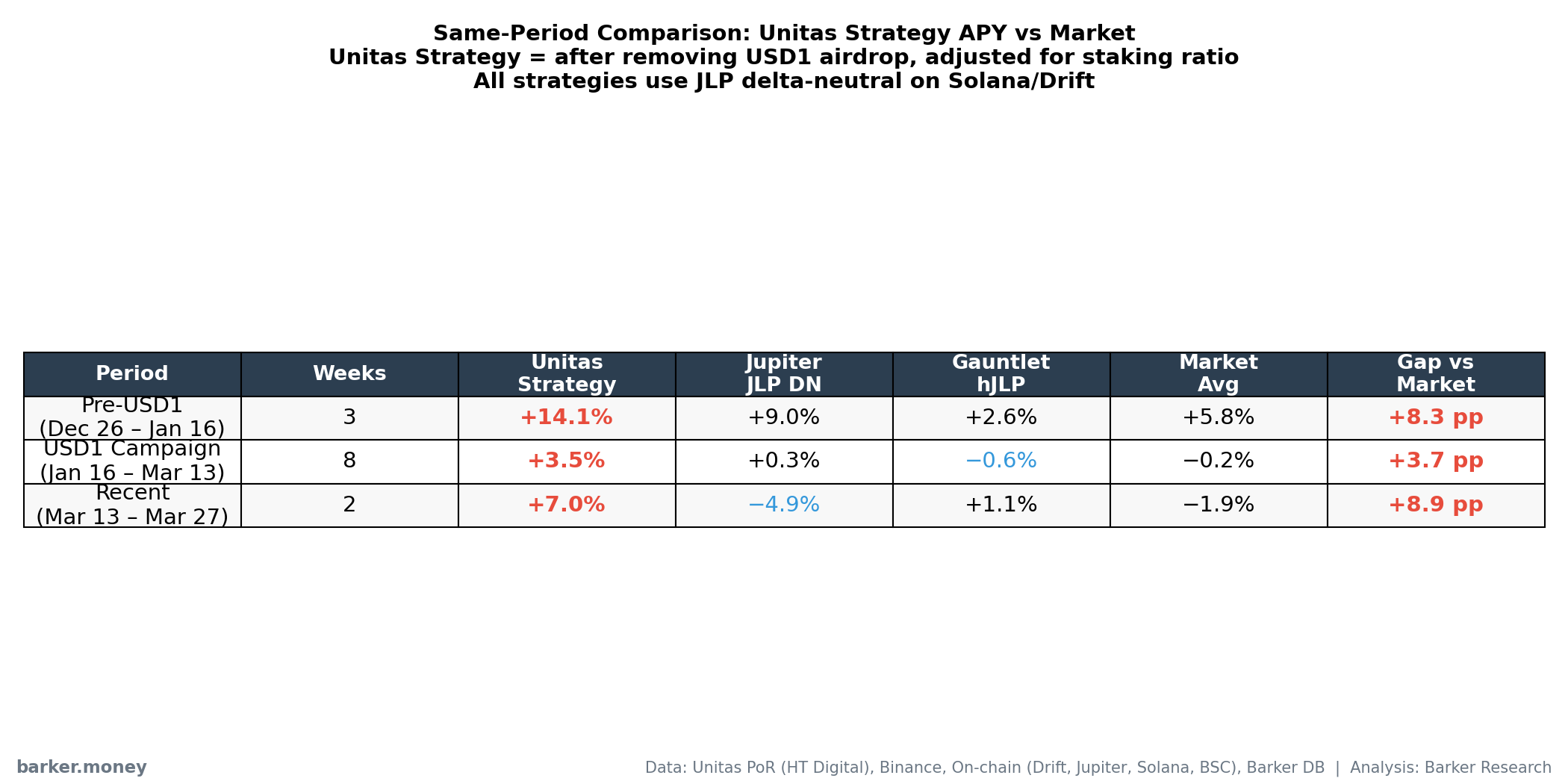 Table: Same-period strategy APY comparison across three phases. Unitas Strategy = after removing USD1 campaign income.