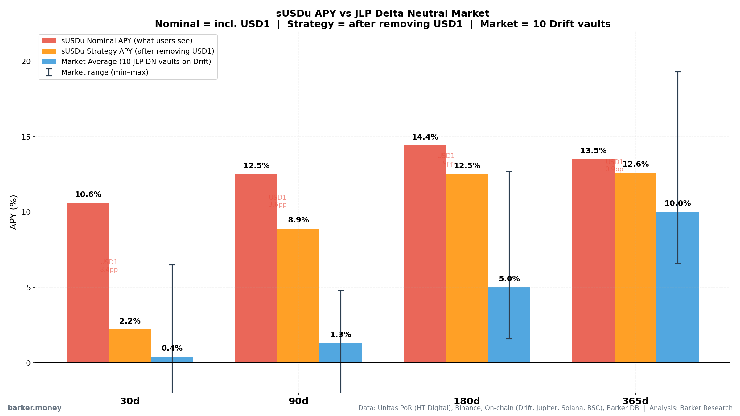 Chart: sUSDu vs market across four time windows. Red = nominal APY (what users see), orange = strategy APY (after removing USD1), blue = market average of 10 vaults. Error bars show market min–max range.