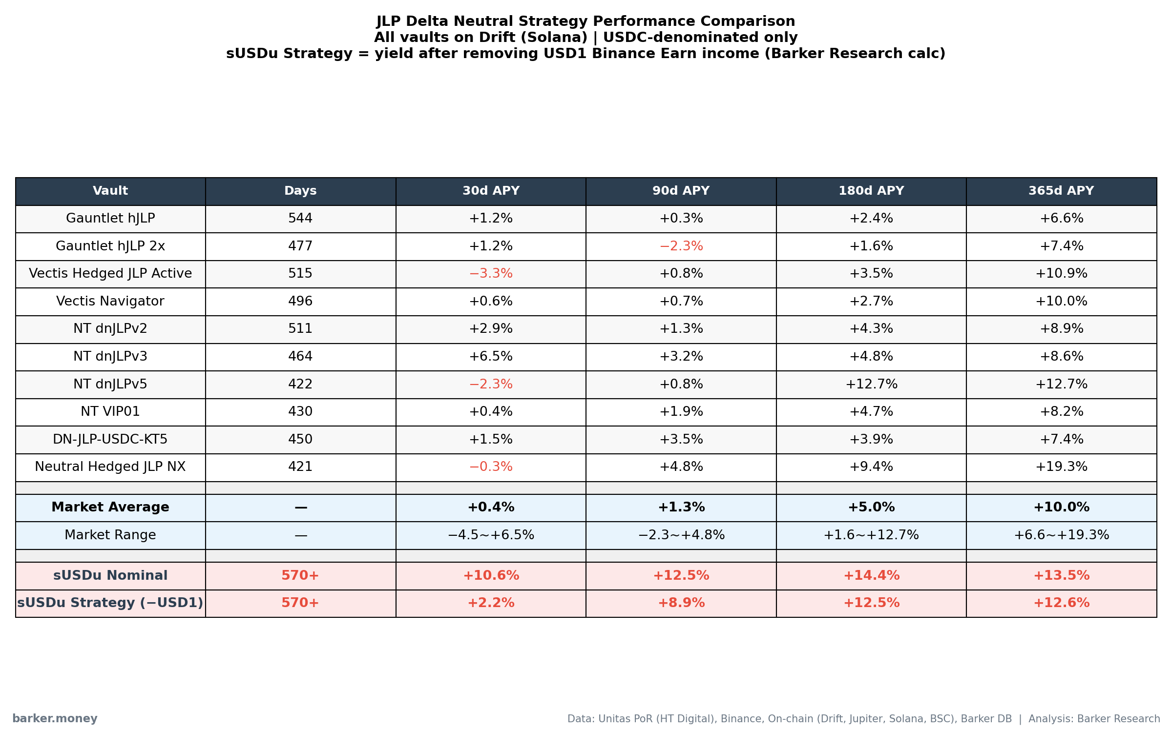 Table: 30d/90d/180d/365d APY for 10 USDC-denominated JLP Delta Neutral vaults on Drift, compared with sUSDu. Data source: Drift on-chain API, as of March 30, 2026.